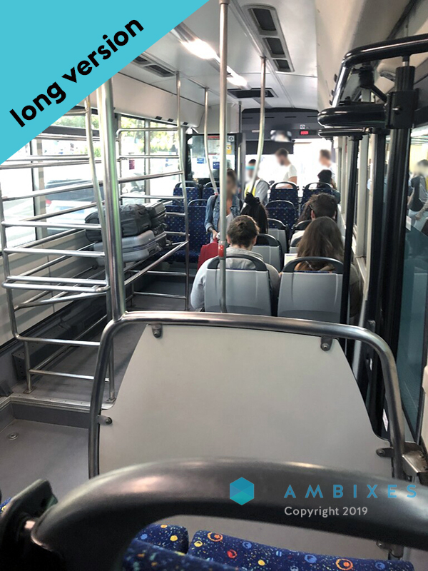Bus ride, 9 stops, bumpy road, many passengers, talking, German, Italian, Spanish, bus stops, doors opening and closing, people getting on and off, ventilation on and off, long version, Ibiza, Spain