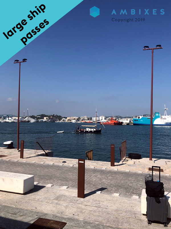 Port, large ship sails by, alarm, air horn, waves, sea gulls, distant people, Ibiza, Spain