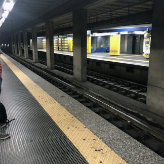 Subway train platform, trains approaching and leaving, air valve, whistle, Rome, Italy